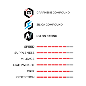 採用石墨烯+二氧化矽技術的競賽級配方,此耐用複合材料專為持久抓地力與低滾動阻力優化,並具備延長耐用性。
