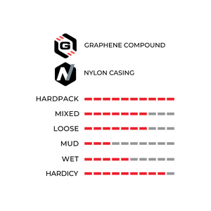 Terreno Zero 的中央胎條改編自 Corsa 公路競賽系列,其革命性的魚鱗狀胎肩則源自 Terreno Dry 礫石輪胎。這項技術結合減少了整個接觸區域的滾動阻力,同時在過彎、騎行礫石或應對濕滑條件時增強抓地力。注入石墨烯的複合材料提升了耐用性、抓地力與速度,並搭配一款柔韌耐用的 Lite 尼龍胎體,在中央胎條處增加了防刺穿保護。